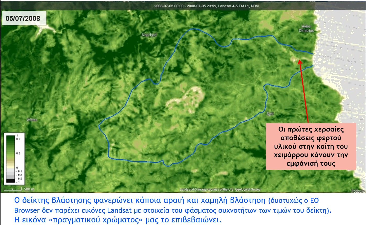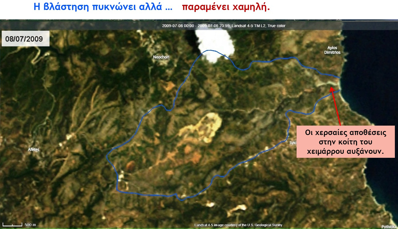 Τούτο διότι με μια προσεκτική ματιά στις δορυφορικές εικόνες… παρατηρούμε πως όχι μόνο δεν επικάθισε νέο φερτό υλικό πάνω στο υπάρχον αλλά και πως άρχισε να φύεται και να αναπτύσσεται βλάστηση επάνω του.